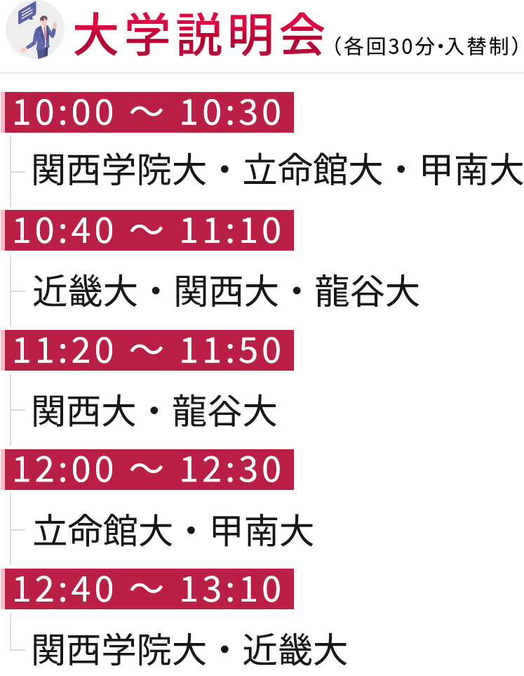 説明会は1校30分の入替制。時間帯ごとに大学が入れ替わるため、続けて参加することで、複数大学の情報を効率よく比較できます。