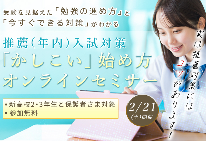 学校推薦型選抜で合格をつかむ鍵は、早めの情報収集と計画的な準備です。このセミナーでは、最新の入試動向から実際の合格ステップまでをわかりやすく解説。