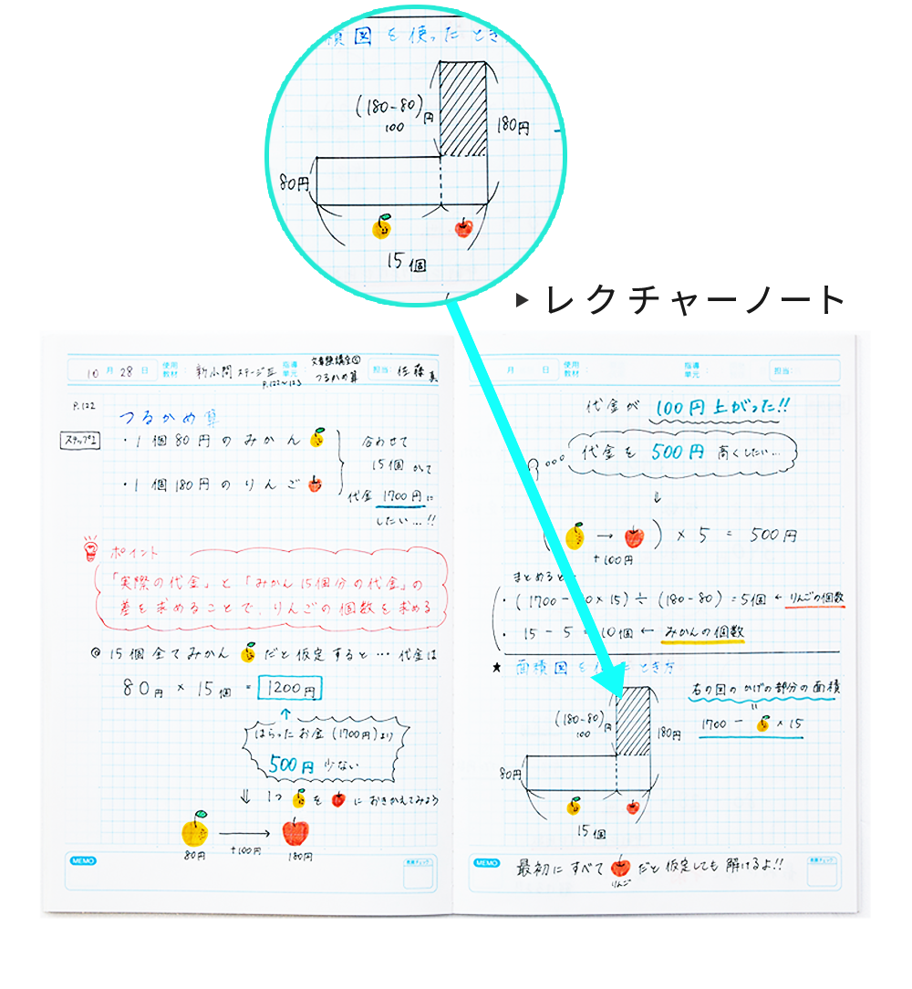 授業内容を講師が生徒のノートに直接書き込んでいくのが、個別館のレクチャーノートです。図やイラストを取り入れながら、考え方を視覚化することで、理解しやすく楽しく学べるノートを心がけています。一人ひとりに合わせて表現や書き方も工夫し、「復習しよう」と自然に思えるノートづくりを行っています。