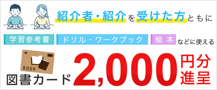 ②兄弟姉妹・友人で一緒に冬期講習を受講、または個別館生の紹介で受講の場合、紹介者・紹介を受けた方ともに図書カード2,000円分を進呈いたします。