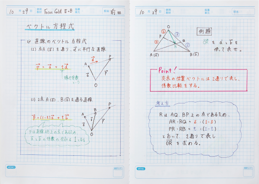 レクチャーノートには重要な語句や必須ポイントが記載されているだけでなく、細かな内容や問題の解き方についても分かりやすく先生が書き込んでくださっていました。授業中だけでなく、家に戻ってからもレクチャーノートを見返すことができ、テスト前の復習だけにとどまらず、日々の学習にも大いに活用することができました。レクチャーノートは学びを深め、学習の効率を高める助けとなりました。