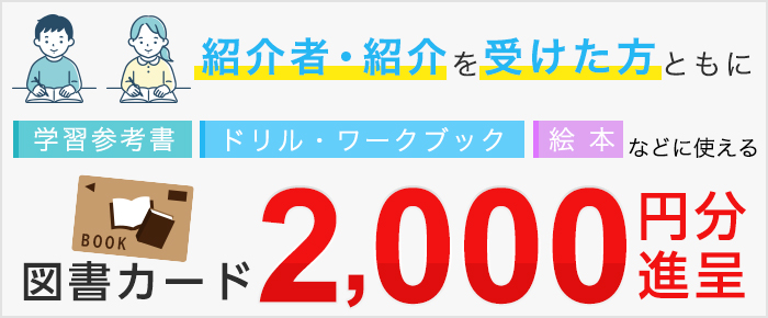 ②兄弟姉妹・友人で一緒に冬期講習を受講、または個別館生の紹介で受講の場合、紹介者・紹介を受けた方ともに図書カード2,000円分を進呈いたします。